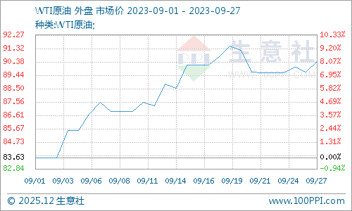 原油市场,当前来看宏观转弱,但沙特减产导致原油供给下降、美国原油和成品油库存下降,供需趋紧,国际油价高位震荡,截止9月26日,美国WTI原油期货主力合约结算价报90.39美元/桶,布伦特原油期货主力合约结算价报92.43美元/桶。PX市场从供需基本面来看,国内仅剩宁波中金160万吨装置年检计划,整体供应相对平稳,但日韩PX开工负荷延续低位运行,因此对价格上仍比较坚挺,截止9月末国内PX出厂价格为9500元/吨,较月初价格9100元/吨上涨4.40%,同比上涨5.56%。