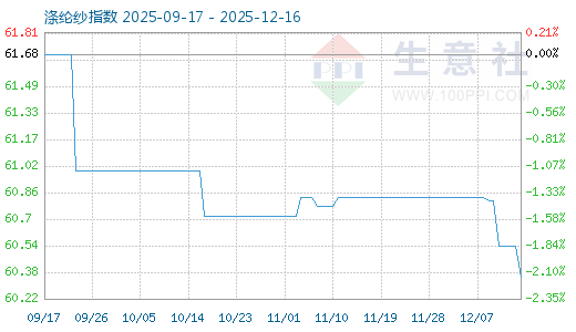 12月13日生意社涤纶纱指数为60.54,与昨日持平,创下周期内的历史新低,较2013年04月09日最高点102.16点下降了40.74%。(注:周期指2013-03-01至今)
