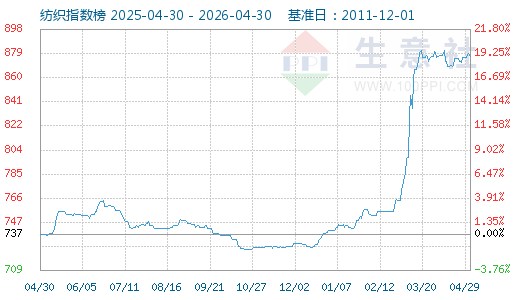4月17日生意社纺织指数为875点,与昨日持平,较周期内最高点1156点(2018-09-03)下降了24.31%,较2020年08月13日最低点681点上涨了28.49%。(注:周期指2011-12-01至今)
